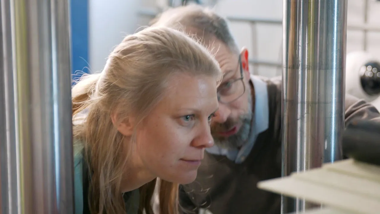 The composite panel breaks with a big bang, and the cracks are carefully examined by Annika Edström, Lead Mechanical Engineer at Oceanbird and consultant Linus Fagerberg, Ph.D. Lightweight Structures & CEO, Lightness. They are in Alfa Laval´s material and chemistry test center to investigate at which loads the composite panel breaks.
